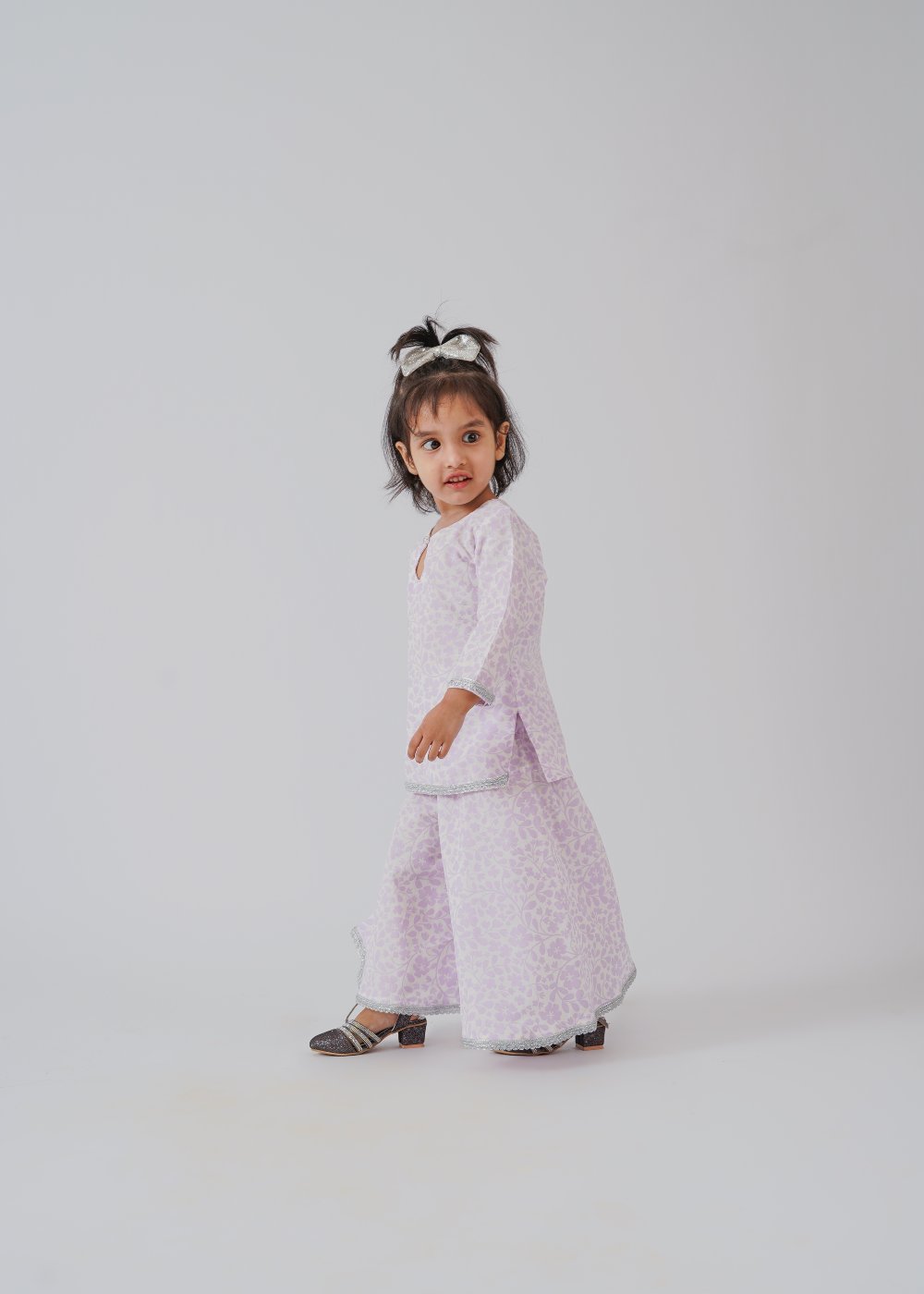 The Lilac Shirt Farara Set is a fun and breezy outfit made from lightweight purple floral printed lawn silk, perfect for girls who love to twirl and play. Its soft fabric keeps things comfy while the pretty floral design adds a splash of charm to every day. Ideal for sunny days and happy adventures!