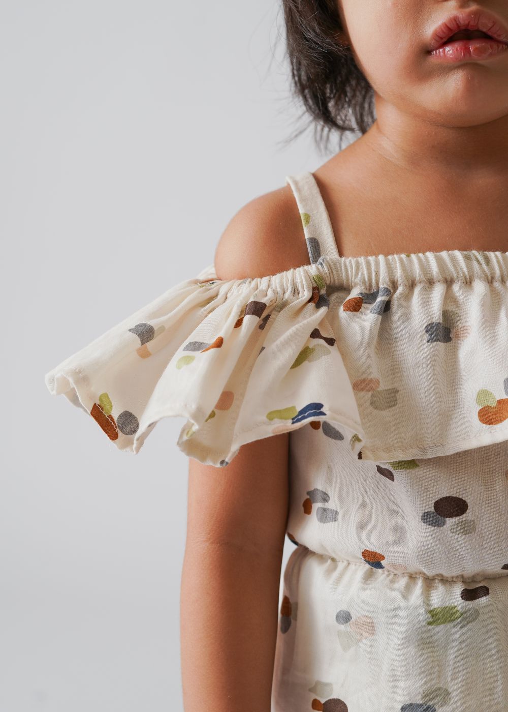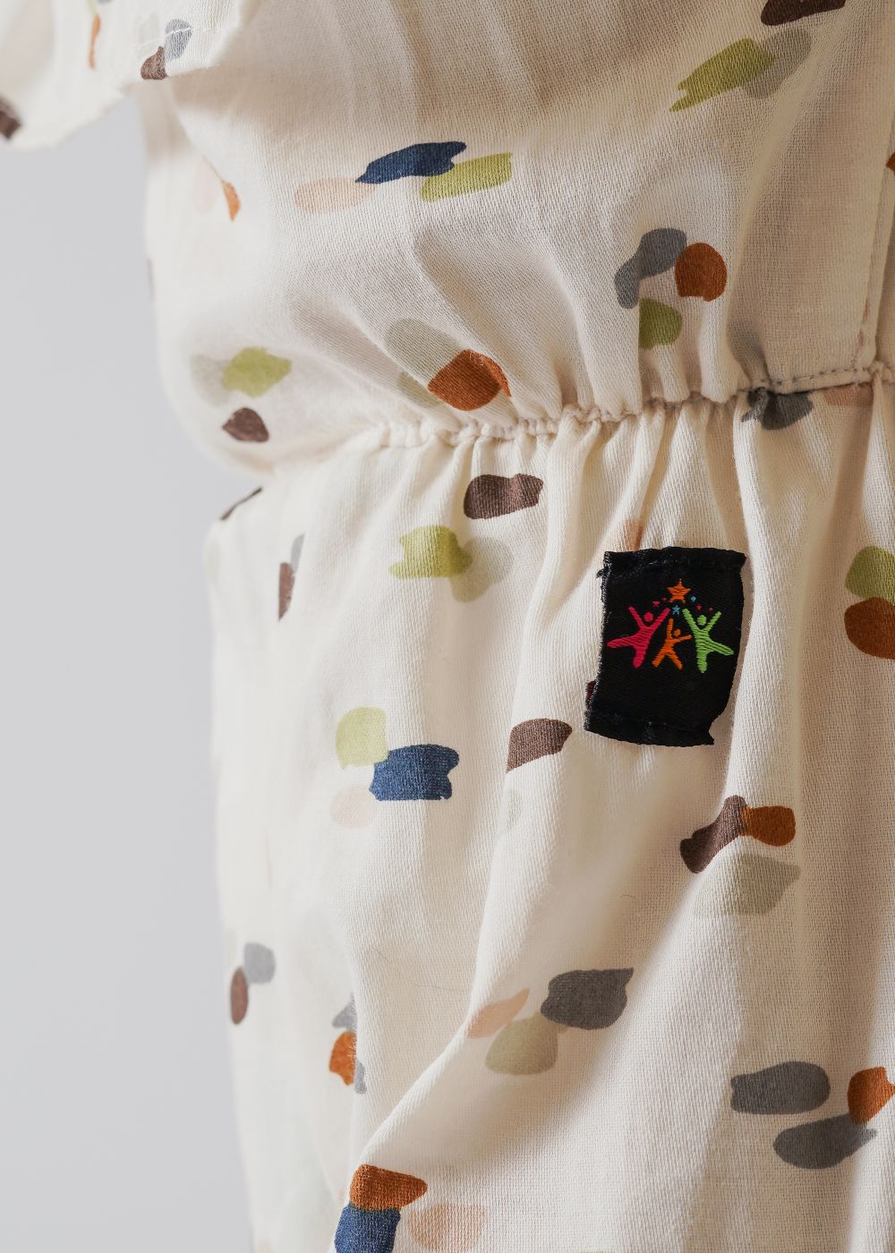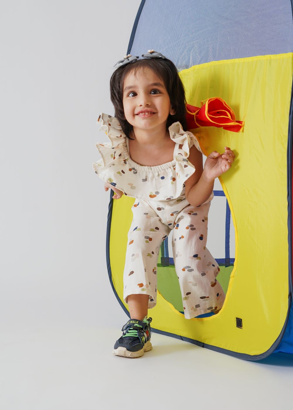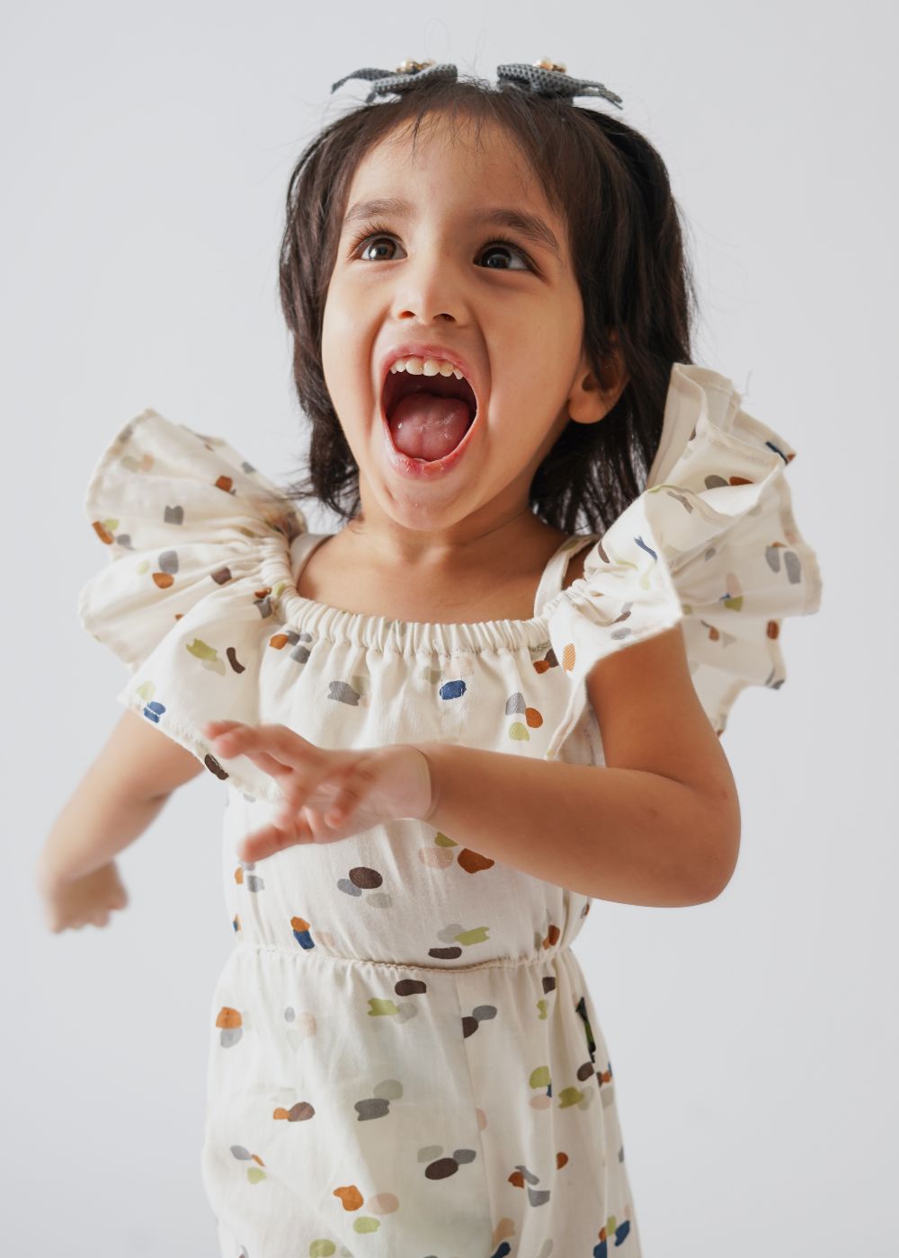 This White Dotted Jumpsuit is perfect for kids who love to play in style! Made from soft, breathable printed twill, it’s comfortable for all-day adventures. The cheerful white fabric dotted with fun prints adds a playful touch, making it a favorite for both playtime and special outings.